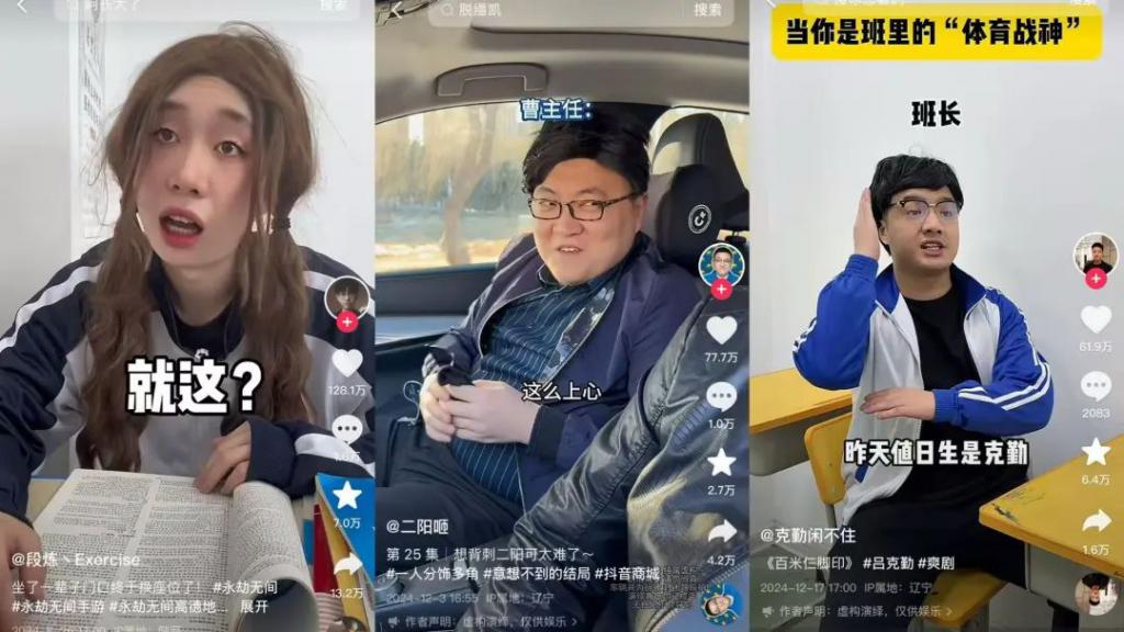 "一人分飾多角"、以戲劇性極強的形式深度還原不同生活情境如校園生活、職場生活的搞怪戲精大戲占據(jù)絕對主流,代表賬號有@脫韁凱、@二陽咂、@克勤閑不住、@段煉丶Exercise、@主持人于歡 等。