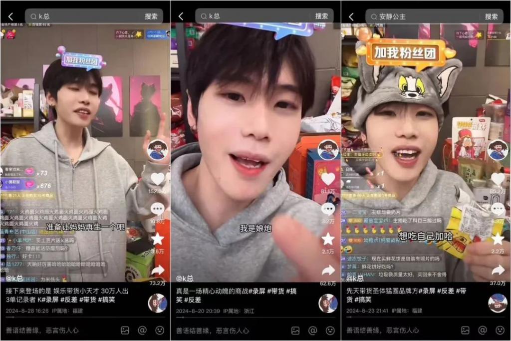 一位是打破常規(guī)帶貨方式的@K總,他在帶貨時喜歡與其他主播連麥嘮嗑,并且經(jīng)常靈機一動說出許多令人捧腹的帶貨段子,直播間抽象而松弛,笑料不斷,吸引了眾多網(wǎng)友圍觀;
