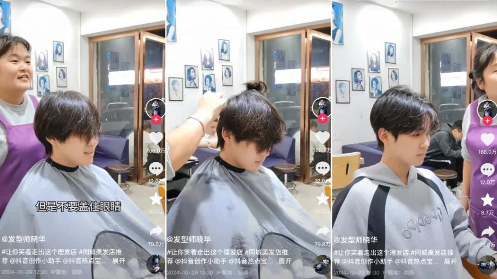 比如才藝技能賽道的@發(fā)型師曉華,于2024年2月開始在抖音發(fā)布自己為理發(fā)的加速視頻,展現(xiàn)出了讓人眼前一亮的理發(fā)效果。在幾條爆火視頻的帶動下,技術(shù)過硬、聽得懂話、且收費合理的曉華知名度借此進一步打開,隨之而來的是線上線下同步?jīng)坝慷鴣淼牧髁俊?/p>
