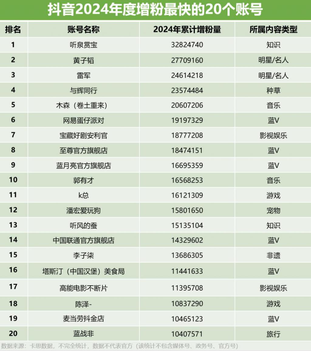 歲末年初,又到了一年一度的盤點之際。和往年一樣,卡思數(shù)據(jù)依然統(tǒng)計出了2024年一整年抖音上漲粉數(shù)最多的1000個賬號,并從數(shù)據(jù)維度、內(nèi)容維度同時出發(fā),帶領(lǐng)大家一起深度復(fù)盤過去一年抖音內(nèi)容生態(tài)的整體走勢,并從中提煉出那些值得關(guān)注的潛力賽道、創(chuàng)作趨勢、不容忽視的創(chuàng)作機會等,以期能為相關(guān)從業(yè)者帶來一定的參考和啟發(fā)。我們一起來看:(注:以下數(shù)據(jù)來源為卡思數(shù)據(jù),不代表官方)